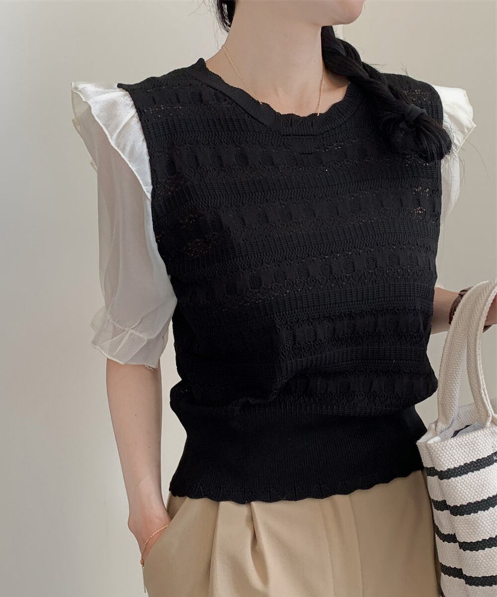 半袖 ニットトップス クールネック プルオーバー 春夏 フェミニン ニットブラウス 袖切り替え 透け感 韓国風 きれいめ