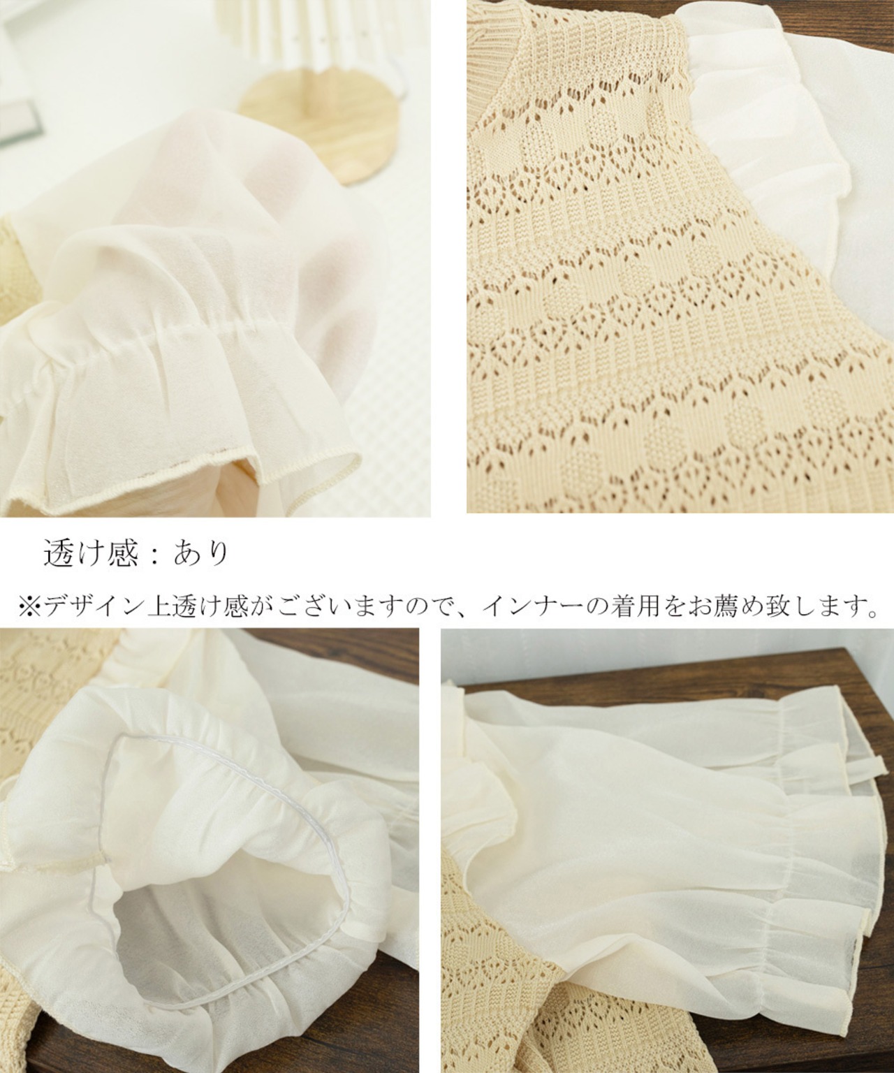 ニットとシフォン素材が組み合わさった、大人可愛いトップスです。