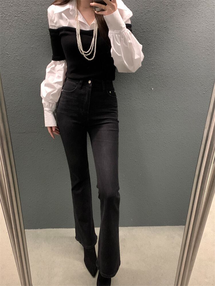 柔らかな雰囲気 襟を正す ブラウス トップス スリム 色をぶつける 上着 縫付 フェイク2ピース 長袖