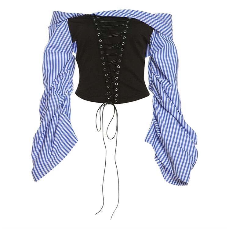 一気に大人モード トップス ストライプ つなぎ ギャザリング スリム シャツ ブラウス 腰を締める